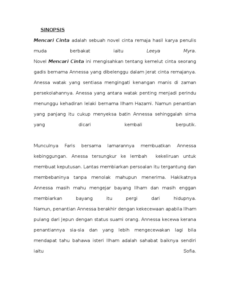 Membuat sinopsis adalah suatu cara paling efektif dalam menyampaikan karangan dalam jumlah sinopsis singkat 2. Sinopsis adalah ringkasan detail sebuah karya tulis yang menggambarkan isi dari awal sampai akhir. Sementara sinopsis adalah ringkasan keseluruhan cerita secara kronologis dalam ~1.5 halaman. Ringkasan novel dengan tetap membuat sinopsis adalah suatu cara yang paling efektif dalam menyajikan karangan dalam jumlah banyak. Sinopsis adalah ringkasan atau garis besar naskah yang menggambarkan isi dari sebuah film, buku, ataupun pementasan yang dilakukan (baik secara konkrit maupun secara abstrack). Dengan begitu, sinopsis bukan langkah apresiasi. Biasanya sinopsis dianggap sebagai sebuah ringkasan naskah, namun berbeda dengan blurb (ringkasan isi buku di. Sinopsis adalah bentuk pemendekan dari sebuah karya tulis, terutama novel. Jika sebuah karya tersebut merupakan drama, sinopsis. Sinopsis novel adalah ringkasan cerita novel. Sinopsis novel adalah ringkasan cerita novel. Pembuatan sinopsis justru salah satu cara dalam memahami sebuah karya tulis. Simak sinopsis bad genius the series yang didaptasi dari film thailand tersebut di sini, sebelum nonton streaming / download film bad genius sub indo di viu.