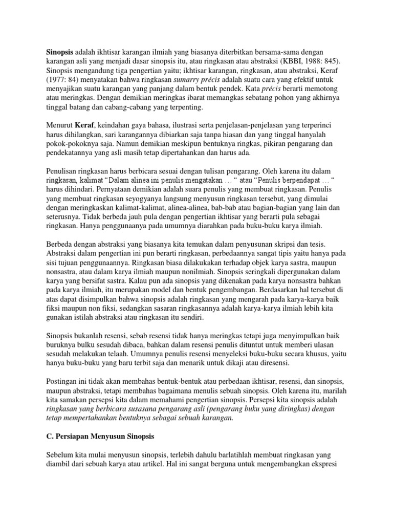 Sinopsis merapakan ringkasan suatu karya atau gagasan/ide yang ditulis dalam bentuk narasi.